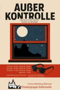Wir freuen uns sehr unsere diesjährige Produktion vorstellen zu dürfen: die rasante Komödie „Außer Kontrolle“. Mit viel Witz, Fensterknallen und überraschenden Wendungen nehmen wir euch mit in einen Abend, der kein Auge trocken lässt.